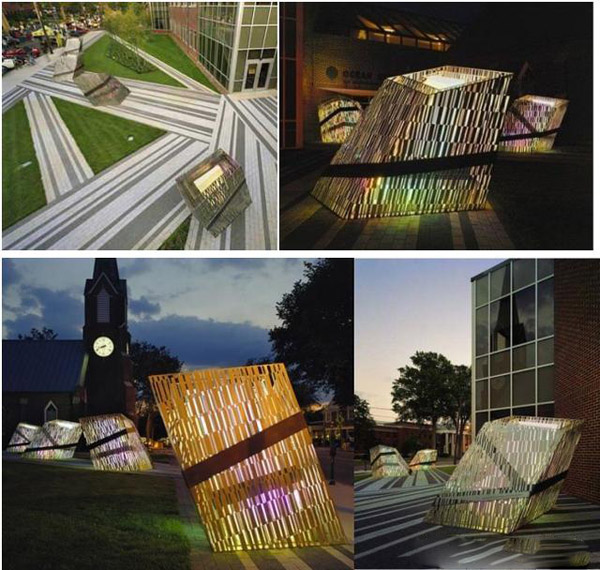 美國Mikyoung Kim完成了新澤西州海洋縣公共圖書館門前的一系列景觀照明設計。這個由激光切割不銹鋼和玻璃構成的景觀燈具,應用了條碼圖案來表達在數字時代下信息的傳播。五個一組的燈具被用激光切割成的鋼鐵包裹在一起,它們既能反射光線,又能從內部發出光芒,從白天到黑夜都有變化。